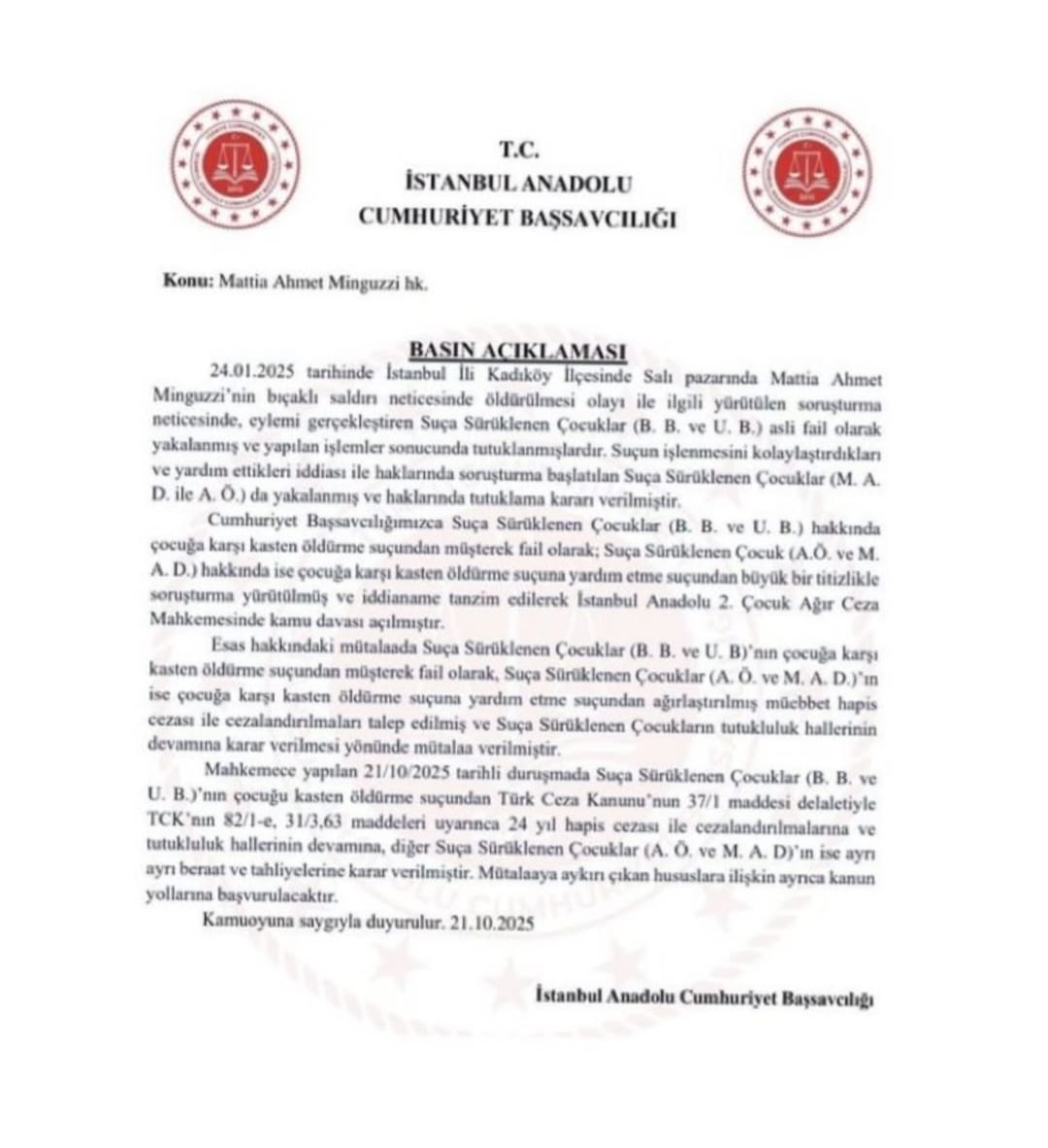 Savcılığın açıklamasında, 24 Ocak 2025 tarihinde Kadıköy Salı Pazarı’nda Mattia Ahmet Minguzzi’nin bıçaklı saldırı sonucu öldürülmesiyle ilgili soruşturmanın detaylarına yer verildi. Açıklamada, B.B. ve U.B. adlı suça sürüklenen çocukların asli fail olarak tutuklandığı, M.A.D. ve A.Ö.’ün ise suça yardım ettikleri iddiasıyla haklarında soruşturma başlatıldığı belirtildi.